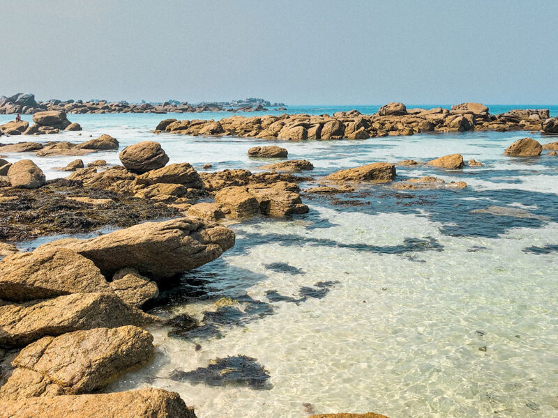 C’est sur les conseils avisés de mes abonnés bretons sur Instagram que j’ai glissé le hameau de Meneham, niché dans la commune de Kerlouan, dans le nord Finistère, dans mon itinéraire. Et quelle heureuse idée ! Cette perle mérite assurément le détour ! À mon arrivée, un parking bien pratique m’accueille, situé à deux pas de ce petit village de pêcheurs aux toits de chaume et d’ardoise. J’entame ensuite mon exploration à travers de petits sentiers, passant devant un gîte en activité, un bistrot toujours prêt à réjouir les visiteurs, et de charmantes petites maisons en pierre. Érigé pour surveiller la côte, le corps de garde, premier édifice du hameau de Meneham, capte immédiatement mon regard. Niché entre deux imposants rochers, il dégage une atmosphère véritablement singulière. Le monument, minutieusement restauré, fait le bonheur des photographes et des visiteurs. Puis, tournant mon regard vers la mer, je suis tout simplement ébloui ! Une petite plage abrite des rochers aux formes étonnantes, et surtout, une eau d’une clarté cristalline, aux nuances de bleu digne des Caraïbes ! Et pourtant, je suis bel et bien en Bretagne ! La carte postale qui se dessine devant moi est tout simplement incroyable, le décor d’une beauté saisissante, et la nature y déploie une splendeur insolente. Je n’aurais jamais imaginé que la mer puisse revêtir une telle grâce sur cette portion du territoire. Certes, elle est fraîche, mais d’une beauté à couper le souffle ! Me voilà définitivement face à l’un des plus beaux endroits de ma chère France, et sans doute l’un de mes coups de cœur de ce road trip. Cela en dit long sur l’exceptionnalité de cette adresse ! Gardons cependant cette pépite bien précieusement, à l’abri des foules trop nombreuses.